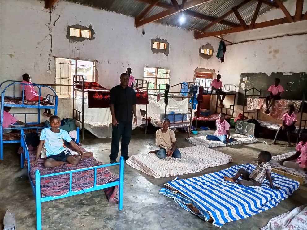 Bei unserem Besuch in der Primary School in Bukalammuli hatten wir Gelegenheit, das an die Grundschule angeschlossene „Internat“ – wie Pater Josef Ssesaazi es nennt- zu besichtigen. Dabei handelte es sich um einen einfachen Raum, eine Art Halle, ohne elektrisches Licht mit wenigen Betten .